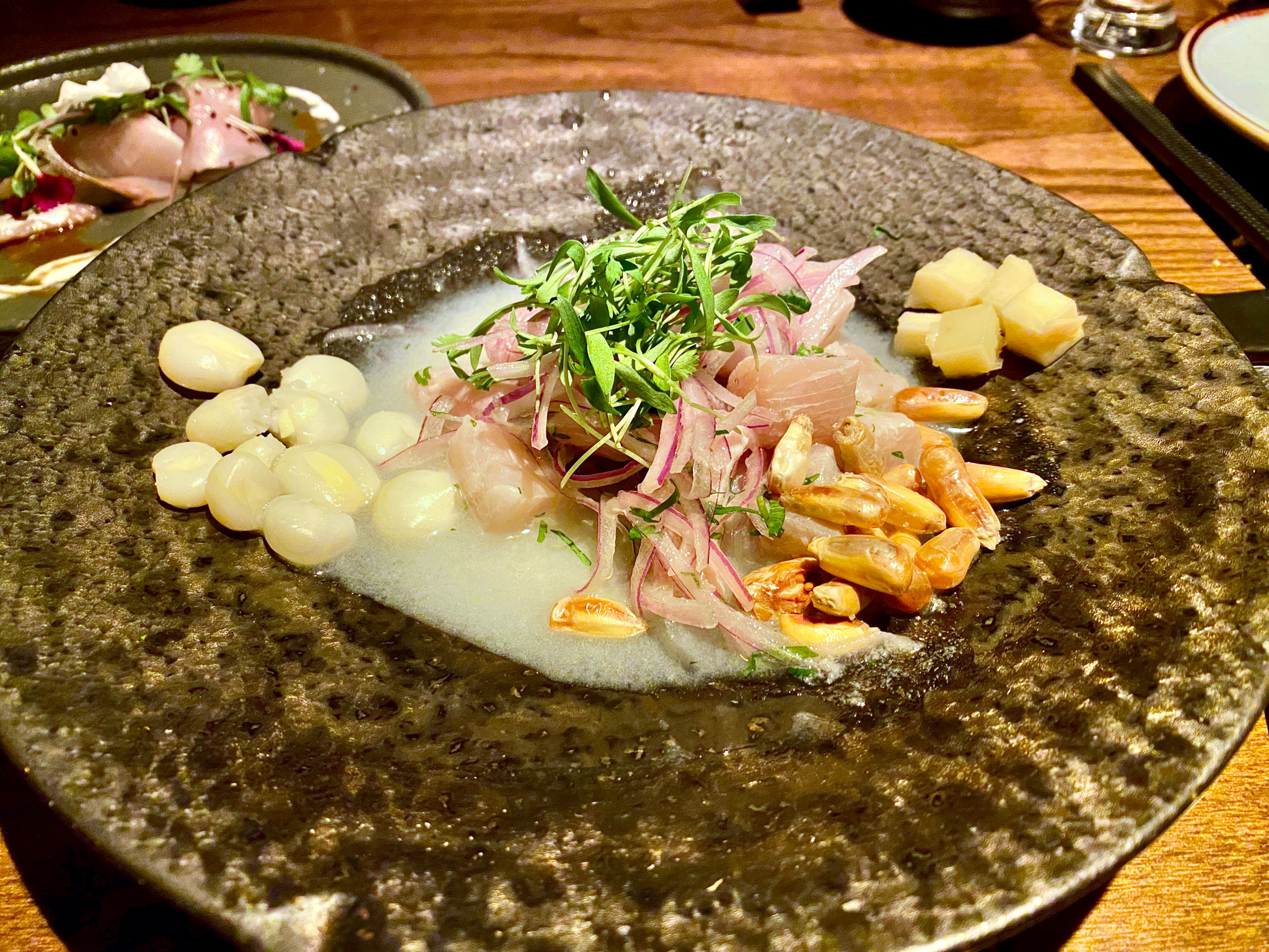 Izakaya is a Japanese style of dining with small plates meant for sharing. Several items on Isu’s menu fit here too. Finally, Nikkei is Japanese-Peruvian cuisine that originated with Japanese immigrants in Peru. Both Japanese and Peruvian cuisines are seafood forward. One of the most obvious and frequent ingredients defining nikkei is the use of raw fish and ají.