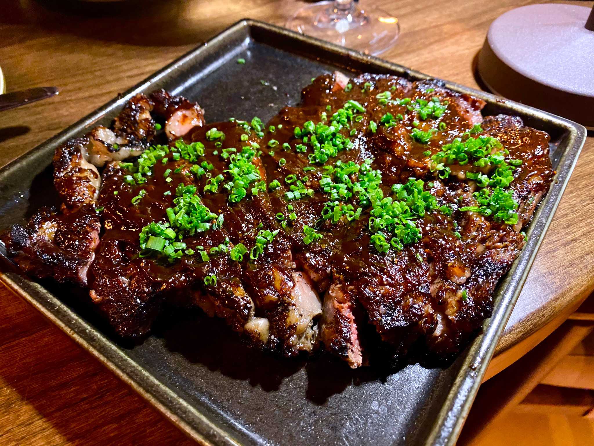 We had three of the five items from the Hot section of the menu. The Black Cod was silky and buttery with sweet-heat miso and bright, tanginess from the salsa criolla. The Wagyu Ribeye was rich, marbled beef with deep umami, subtle chili warmth, and a slight vinegary pop from the pickled escabeche. The Crispy Rock Shrimp were light and crunchy. The aji verde dipping sauce added a creamy, herbaceous kick.